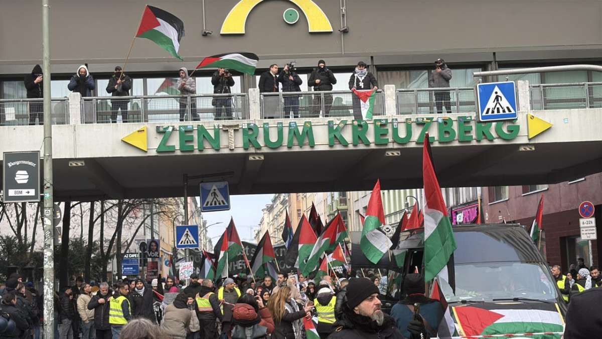 Gösteriyi "Zafer yürüyüşü" olarak niteleyen Filistin destekçileri üzerinde "Netanyahu’nun sonu", Ateşkes sadece bir başlangıç Alman hükümeti ve Berlin polisi mahkemeye çıkarın", " Almanya İsrail tarafından işgal edildi" ve "Filistin’e özgürlük" yazan döviz ve pankartlar taşıdı.
