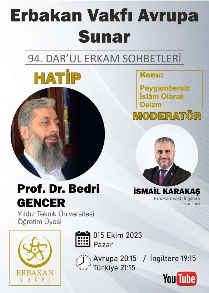 Erbakan Vakfı Avrupa tarafından organize edilen Dar'ul Erkam sohbetlerinin 94'cüsü 15 Ekim Pazar akşamı TSİ 21.15'te gerçekleştirilecek.Moderatörlüğünü Erbakan Vakfı İngiltere Temsilcisi İsmail Karakaş'ın yapacağı, ''Peygambersiz İslâm Olarak Deizim'' konusunun konuşulacağı programın konuğu Yıldız Teknik Üniversitesi Öğretim Üyesi Prof. Dr. Bedri Gencer olacak.