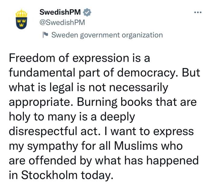 The Prime Minister of Sweden hastened to personally dissociate himself from the shameful and vile public action to burn the Holy Book. A hastily made banner was hung outside her country's consulate general in Istanbul: "We do not share the opinion of an idiot who burns books!" But this is pure hypocrisy! If public actions concerned the interests and symbols of the same LGBT or Jewish communities (even Zionists), then the police would not protect the scoundrels, but would categorically not allow this. Well, the performers of vile performances themselves will simply be raked to the fullest - according to the law! Such selectivity is a consequence of the notorious double standards! When insulting the feelings of some is a crime, and mocking the feelings of Muslims is freedom of speech and self-expression!.. Apparently, someone needs a different line (or front) of confrontation in Europe! But in the countries of Greater Europe (including Turkey and Russia) there are at least 170 million of our co-religionists!
