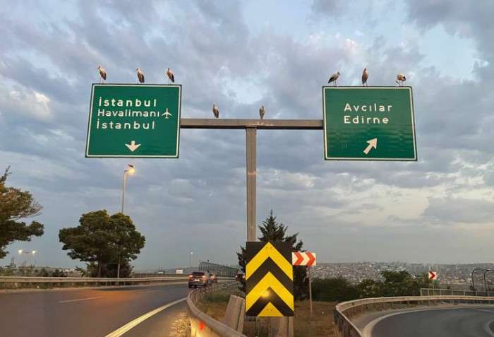 Ağustos ayıyla göç yolculuğuna başlayan leyleklerin İstanbul semalarından geçerken otoyol kenarındaki tabelalar üzerinde dinlendiği anlar görüntülendi.