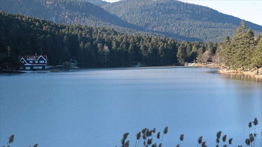 Bolu'nun doğal güzellikleriyle ünlü Gölcük Tabiat Parkı'ndaki gölün yüzeyi buzla kaplandı.