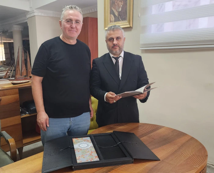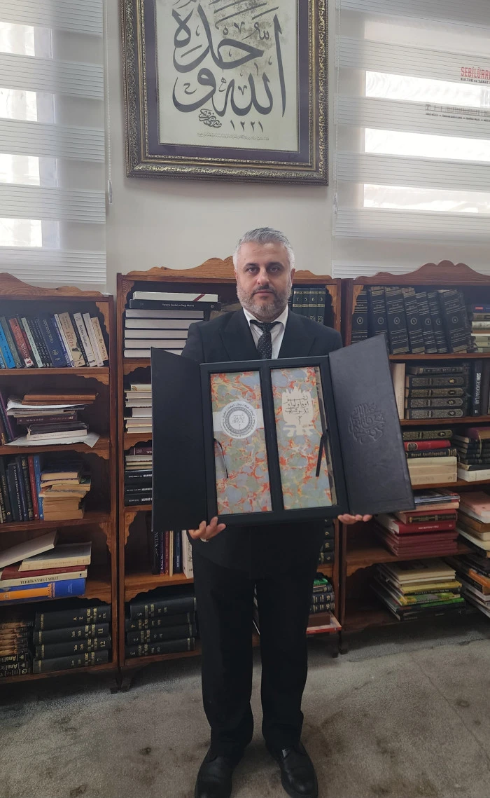 Tapu ve Kadastro Genel Müdürlüğü Arşiv Dairesi Eski Başkanı Zeynel Abidin Türkoğlu , Gazeteci İsmail Karakaş'a Defter-i Evkâf-ı Livâ-i Kuds-i Şerîf'i hediye etti.