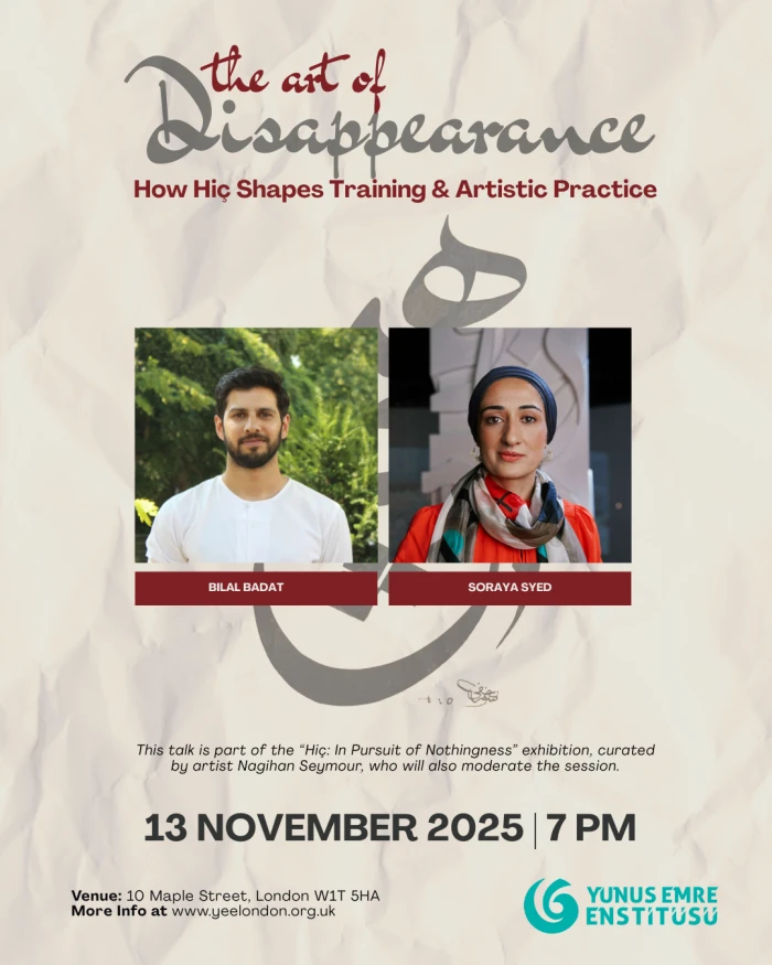 13 Kasım’da gerçekleştirilecek The Art of Disappearance: How Hiç Shapes Training and Artistic Practice başlıklı söyleşide sanatçılar Soraya Syed ve Dr. Bilal Badat, küratör Nagihan Seymour’un moderasyonunda bir araya geliyor. Bu konuşma, “yok olma” eylemini sanatsal disiplinin merkezine yerleştirerek, benliğin silinişini bir yaratım biçimi olarak ele alıyor; sanatın, görünmeyenin peşinde nasıl bir içsel eğitim alanına dönüşebileceğini sorguluyor.