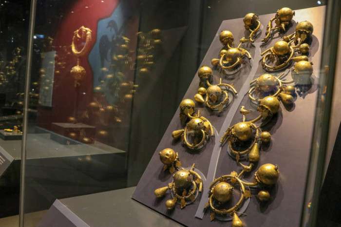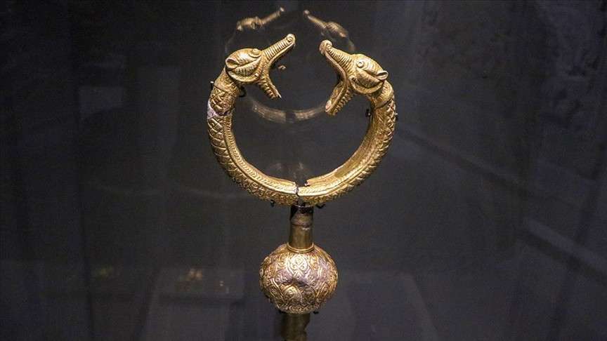 Muş'un Malazgirt ilçesinde 37 yıl önce arkeolojik kazılarda çıkarılan altın kaplamalı ve "çift başlı ejder" işlemeli tuğ, Erzurum Müzesi'nde sergilenmeye başladı.