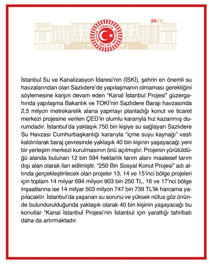 Yeniden Refah Partisi Genel Başkan Yardımcısı ve İstanbul Milletvekili Doğan Bekin, İstanbul’un en önemli su havzalarından biri olan Sazlıdere’de devam eden yapılaşmaya ilişkin Çevre, Şehircilik ve İklim Değişikliği Bakanı Murat Kurum’a yazılı soru önergesi sundu.