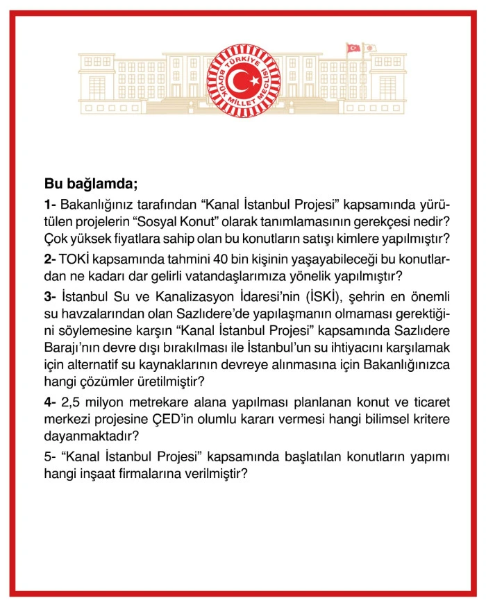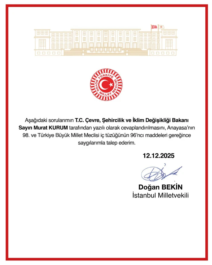 Bekin, İstanbul’un en önemli su havzalarından biri olan Sazlıdere’de devam eden yapılaşmaya ilişkin T.C. Çevre, Şehircilik ve İklim Değişikliği Bakanı Murat Kurum’a yazılı soru önergesi sundu. Önerge, Türkiye Büyük Millet Meclisi’ne (TBMM) iletildi.