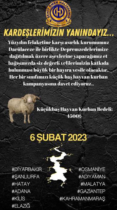 “Kurban kampanyasını dün akşam itibariyle startını verdik, kampanya 24 Mart 2023 tarihinde son bulacaktır. Okul Müdürümüz Mehmet Tatlı hocam bir kurbanla kampanyanın açılışını yapmıştır.
