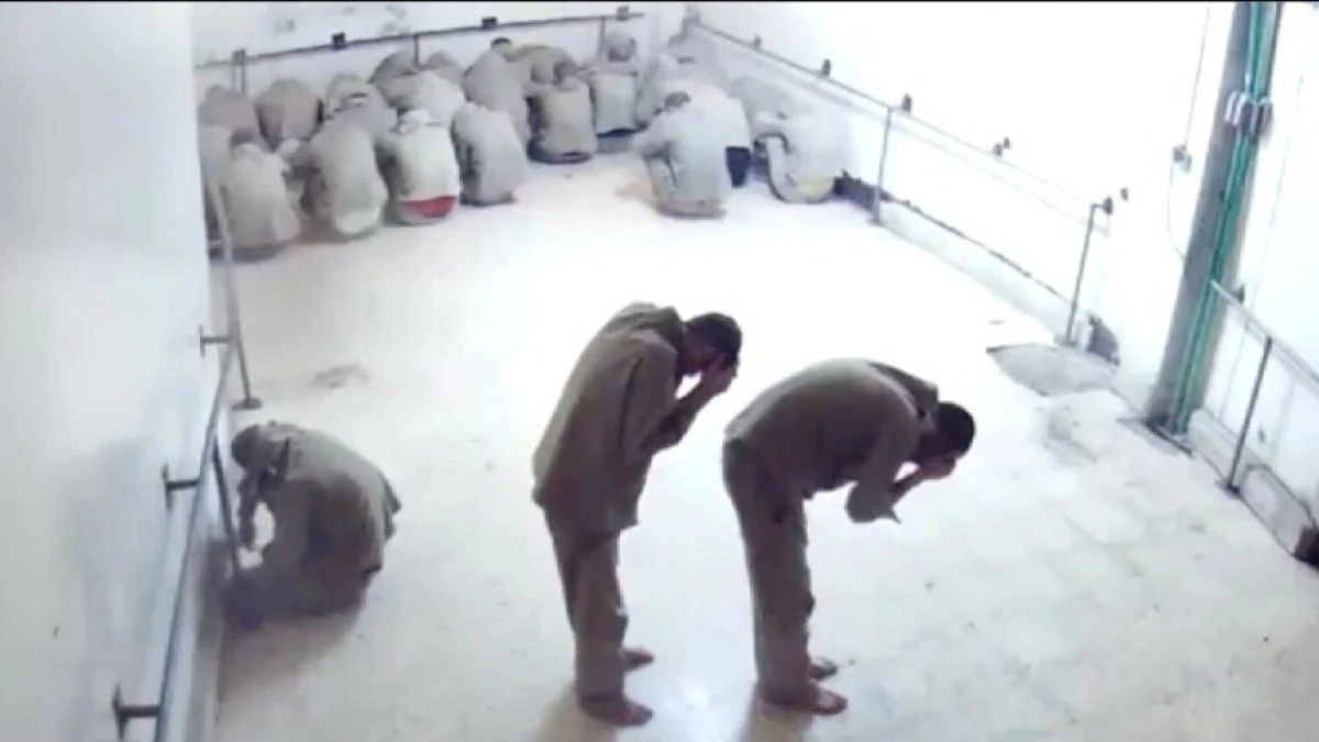 Görüntülerin bir bölümünde, bekleme odası olarak nitelendirilen kapalı bir alanda 20'den fazla kişinin zemine çömelmiş halde bekletildiği görülüyor.